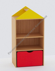 Детский стеллаж стилизован под домики, поэтому гармонично впишется в интерьер детского сада. Яркие цвета ламинированной ДСП, используемой при изготовлении, обязательно создадут радостное и озорное настроение в игровой комнате.