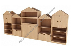 Детский стеллаж стилизован под домики, поэтому гармонично впишется в интерьер детского сада. Яркие цвета ламинированной ДСП, используемой при изготовлении, обязательно создадут радостное и озорное настроение в игровой комнате.