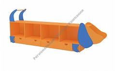Дизайн стеллажа в виде веселой, яркой собачки Таксы привнесёт изюминку в интерьер Вашего детского сада. Стеллаж для детского сада «Такса» порадует Вас не только своей яркостью и оригинальностью, но и функциональностью. Он служит для хранения игрушек, в нём есть открытые полки и выдвижные ящики. Данная модель может быть исполнена в 2х вариантах: