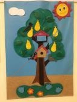 Служит в качестве украшения и практичного учебного пособия, позволяющего показать изменения природы: благодаря креплению с помощью липучки можно представить крону в виде цветущего дерева весной, с фруктами летом, с опадающими листьями осенью и покрытую снегом зимой. Материал: искусственная кожа и пенополиуретан. Съемные части комплекта: крона дерева-3шт. и газон-1шт., по 9 КРАСНЫХ листьев и зеленых, 5 груш, 5 цветков, 3 птицы, 1 скворечник, 1 кормушка для птиц, 5 снежных части, солнце, облако, цветы-5шт. и другое. Общие размеры с кроной: 60 х 100 см