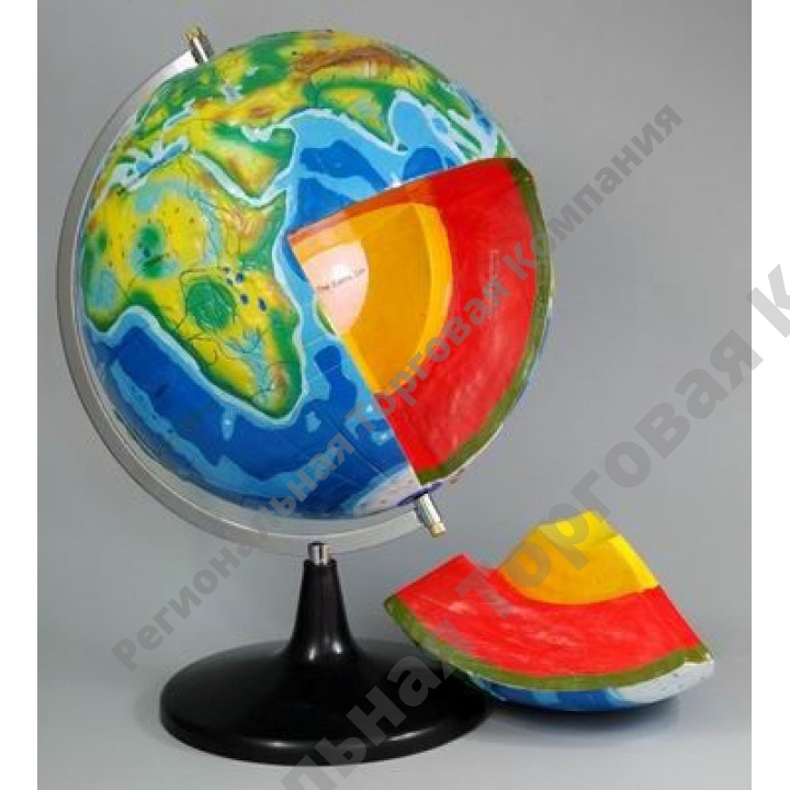 Модель представляет собой рельефный глобус Земли, с вырезанным фрагментом поверхности, что позволяет рассмотреть внутреннее строение земного шара: ядро, мантию, земную кору. Модель изготовлена из пластмассы, раскрашена в естественные цвета. Ее высота составляет ≈ 50см.