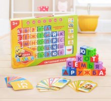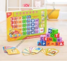 Конструктор обучающий «Алфавит», 60 обучающих карточек, 33 кубика, 4 вида наклеек, часики, 5 карточек с математическим заданием