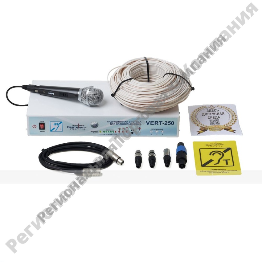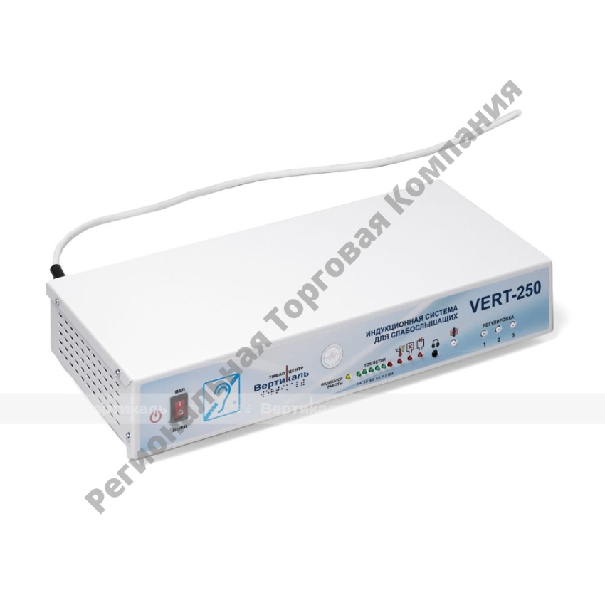 Звукоусиливающая аппаратура - стационарная индукционная система VERT-250 предназначена для применения в больших помещениях до 250 м². Она усиливает восприятие информации людьми с нарушениями по слуху (использующих слуховые аппараты) в ограниченном пространстве и при большом скоплении людей, а также при наличии посторонних звуков или преграды между собеседниками.
