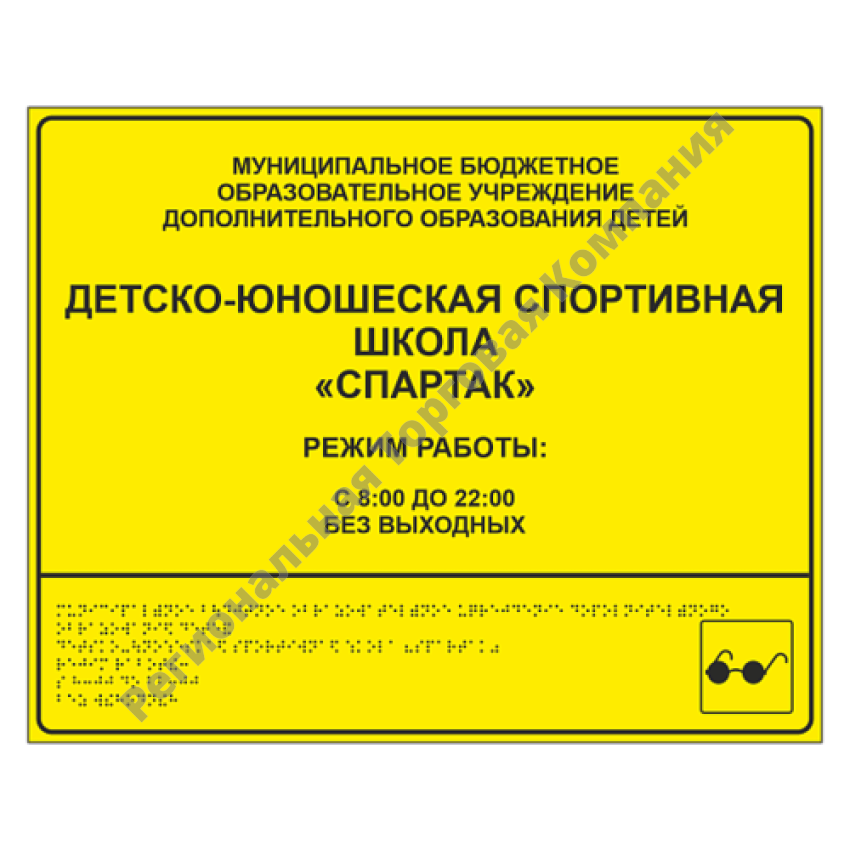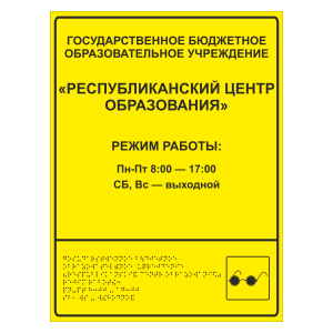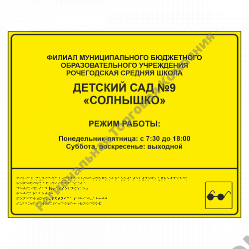 Предназначена для информирования посетителей о режиме работы организации, а также наименовании, ее реквизитах и контактных данных. Ориентировано, преимущественно, на посетителей с ограничениями по зрению. Плоско-выпуклый тактильный текст + шрифт Брайля.