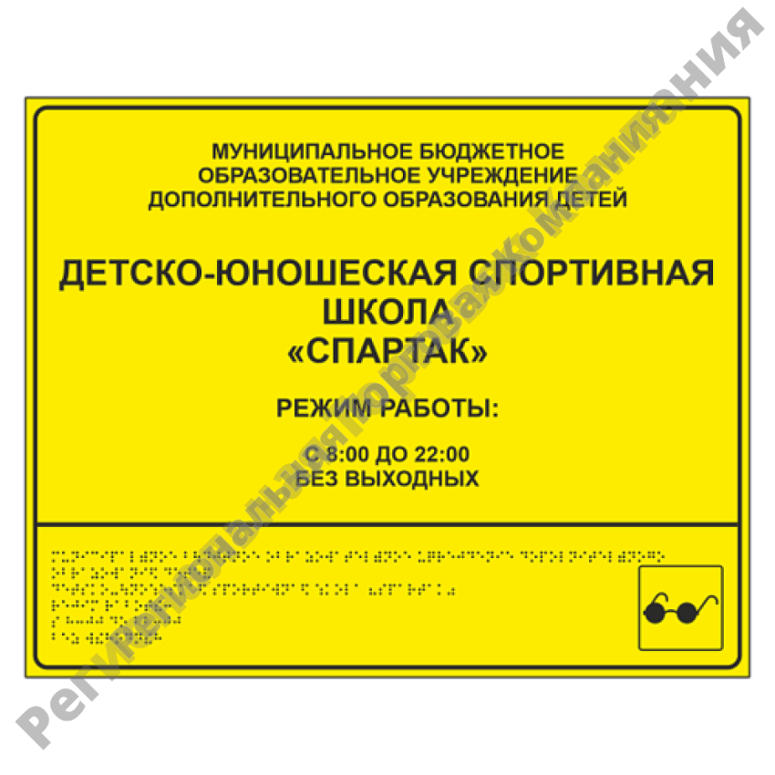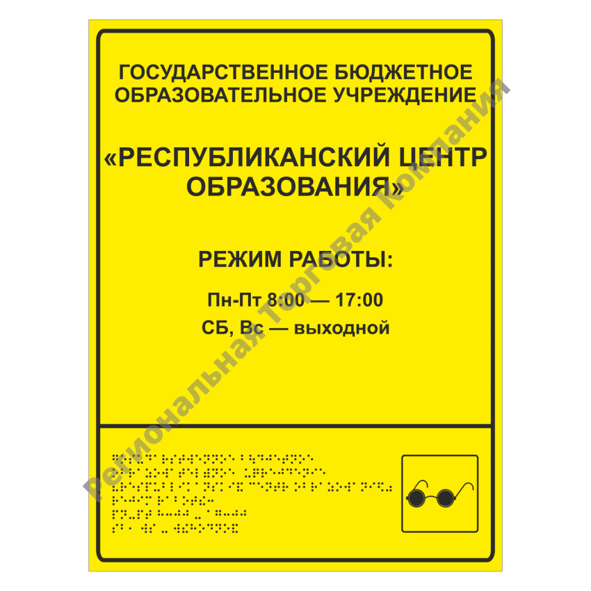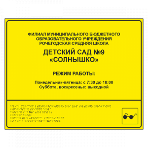 Предназначена для информирования посетителей о режиме работы организации, а также наименовании, ее реквизитах и контактных данных. Ориентировано, преимущественно, на посетителей с ограничениями по зрению. Плоско-выпуклый тактильный текст + шрифт Брайля.