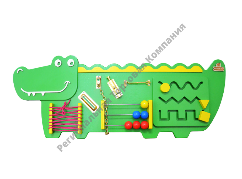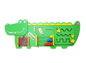Панель «Крокодильчик» выполнена по методике Монтессори и включает несколько модулей: завязывание шнурков, работа с замочками и защелками – все это отлично развивает моторику рук. А игра в лабиринт также поможет развить логику, сделать малыша настойчивее, повысит его внимательность.