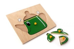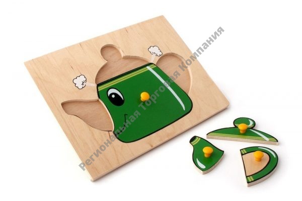 Мозаика представляет собой деревянный планшет размером 24х18 см, на котором размещены 3 вкладыша-пазла, изображающих чайник. Каждая часть снабжена для удобства ручкой-кнопочкой. Мозаика развивает мелкую моторику, внимание, память и логическое мышление ребенка.
