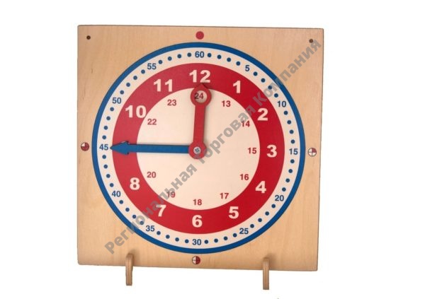 Дидактическое пособие «Часы» представляет собой деревянный планшет с вращающимися стрелками, на котором изображен циферблат, состоящий из двух окружностей: внешняя – минутная (синего цвета) и внутренняя – часовая (красного цвета) с обозначением делений часов от 1 до 12 и от 13 до 24. Цвет стрелок совпадает с цветом окружностей циферблата: минутная стрелка – синяя, часовая – красная. На планшете размещены символические обозначения «четверть часа», «полчаса», «три четверти часа» и «час», которые соответствуют 15, 30, 45 и 60 минутам. В комплект входят 2 ножки-опоры и шнур, с помощью ножек-опор изделие можно устанавливать на столе,а шнур позволит повесить изделие на стену.
