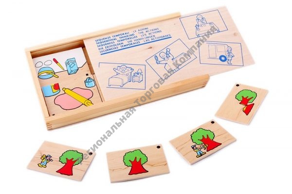 Игровой материал представляет 6 серий сюжетных картинок-карточек: как испечь кексы (4 карточки), как приготовить чай (5 карточек), история про лесоруба (4 карточки), история про мальчика, попавшего в больницу (6 карточек), история про котенка, который хотел поймать рыбку, но разбил аквариум (6 карточек), мамино утро (5 карточек). Все карточки помещены в деревянную коробку с крышкой-задвижкой. Каждая серия, чтобы помочь ребенку, помечена в верхнем углу графическим символом (квадрат, круг, звездочка и др.). Обучающий комплекс используется для игр, осванных на принципе домино. Из картинок, изображенных на карточках, нужно составить связный рассказ с последовательным развитием сюжета. Игра учат ребенка анализировать происходящие события, выявляя, что было сначала и что стало потом.