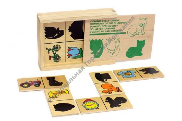 Игровой материал состоит из 20 фанерных карточек размером 12 х 6 см. в коробке. На каждой карточке по 2 картинки: картинка слева изображает знакомые детям предметы, а картинка справа – силуэты, тени предметов, Цвет теней – черный, а предметы изображены яркими сочными красками 3 цветов. Пособие готовит ребенка к восприятию схем, символов, чертежей.