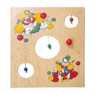 Панель с «экраном» с тремя вырезанными в нем круглыми отверстиями. Внутри каждого из 3 прорезанных кругов подвешены на длинном шнурке по одному цветному колокольчику – мишени. Для сбивания / попадания в колокольчики прилагаются 3 легких цветных шарика (пластиковых мячика). Игровая задача – попасть в колокольчик шариком – мячиком с определенного расстояния. Панель тренирует и развивает мышцы, суставы (мелкую и крупную моторику), ловкость, точность, сосредоточенность, внимательность, глазомер, координацию движений и действий. Панель дает возможность устраивать веселые соревновательные игры и развлечения, конкурсы и олимпиады с детьми дошкольного и младшего школьного возраста.