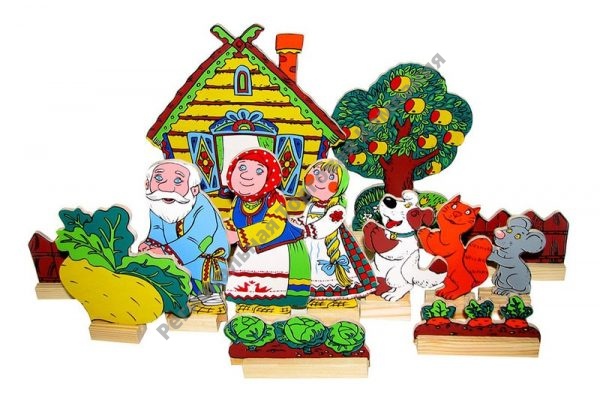 В состав настольного театра «Репка» входит 13 деталей: дед, бабка, внучка, собака, кот, мышка, репка, 2 забора, дерево, домик, 2 грядки с овощами и 13 подставок к ним. Расскажите и покажите своему малышу сказку «Репка», и вы увидите, как эмоционально отреагирует он на увиденное. И это не только театр, но и замечательный логопедический материал. Подрастая, ребенок будет сам разыгрывать сказку, развивая творческое мышление, речь (она становится образнее, выразительнее), обогащая словарный запас. Игра с настольным театром знакомит ребенка с народным творчеством, развивает навыки связной и логической речи, умение пересказывать.