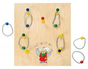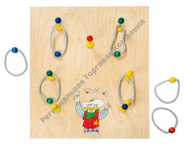 Игровая задача — на каждый из штырей накинуть кольцо из цветного жгута с деревянным шариком внутри, окрашенным в тот же цвет. Панель со штырями можно располагать и на полу и тогда набрасывать кольца – жгуты на горизонтально лежащие цели.