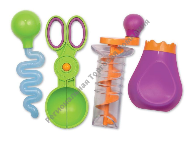 С этим набором из четырех предметов ребенок будет крутить, зачерпывать, сжимать предметы. С помощью набора малыш сможет лучше овладеть навыками мелкой моторики, которые необходимы для того, чтобы научиться пользоваться ножницами и писать.