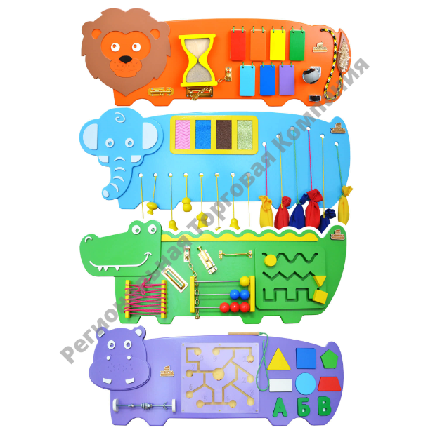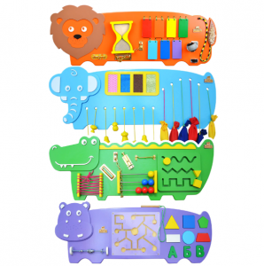 Экономичное решение для детских учреждений — сразу 4 бизиборда в комплекте по цене трех. Включает в себя ряд различных развивающих элементов. Панели предназначены для развития мелкой моторики.