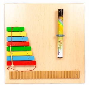 На поверхность нанесено покрытие с использованием защитных декоративных материалов для наружных работ. На "экране" расположены три инструмента для звукоизвлечения (ксилофон, трещотка, шумовой инструмент, имитирующий звуки дождя).
