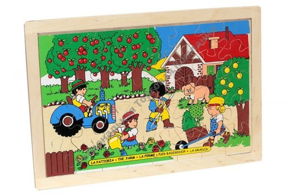 Пазл состоит из 40 фанерных деталей, из которых собирается панно размером 40х27 см, которые выкладываются на деревянной основе. Пазл «Ферма» предназначен для детей от 3 до 6-7 лет.