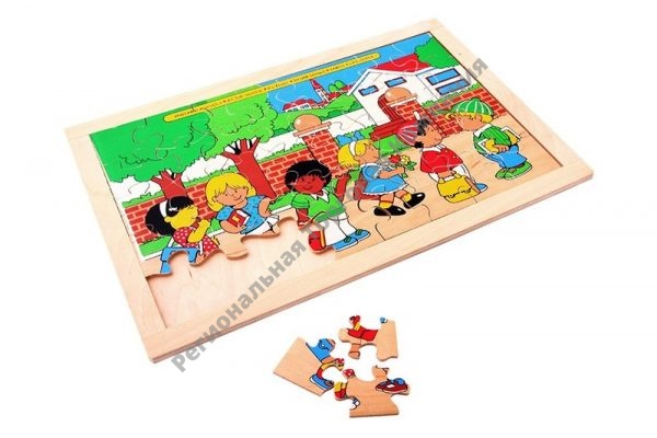 Пазл состоит из 40 фанерных деталей, из которых собирается панно размером 40х27 см, которые выкладываются на деревянной основе. Пазл «Школа» предназначен для детей от 3 до 6-7 лет.
