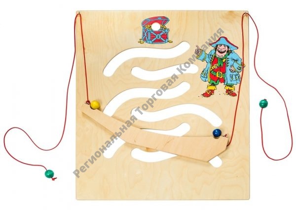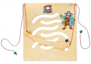 На панели с «экраном» красочно изображены персонажи: слева сбоку лев, снизу справа — охотник и вверху — его замок. Внутри панели сделаны круглые сквозные прорези и нанесен рисунок охотничьей тропы, по которой нужно провести «охотника», спрятавшегося в укрытие, к логову «льва». У «охотника» имеется «пуля» — это может быть шарик или колечко. «Охотник» в «укрытии» с пулей — это полая треугольная формочка с шариком внутри, подвешенная снизу на 2 шнурах.
