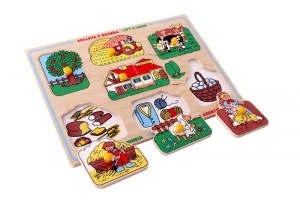 Доска-вкладыш представляет собой состоит из деревянной панели и 5 разных картинок, характеризующих жизнь в деревне (корова, овечка…), каждая из которых снабжена удобной ручкой.
