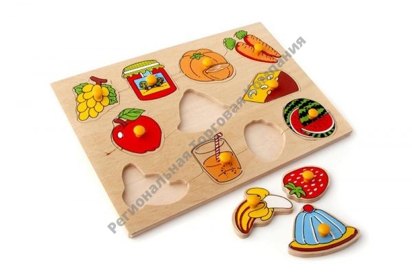 Деревянный планшет размером 29,5х20,5 см, на котором имеются 11 окрашенных в яркие тона вкладышей в виде продуктов питания с удобными ручками-кнопочками. Занятия с данным пособием способствуют развитию зрительно-моторной координации, мелкой моторики, памяти, внимания, а также развитию речи.