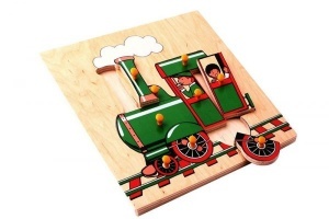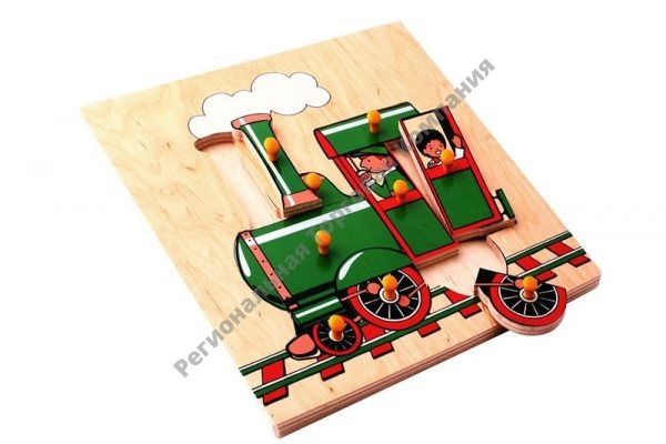 Планшет из серии «техника» размером 31,5х31,5 см. В выемках каждого из планшетов размещено по одной сборной картинке-головоломке с одним из видов транспорта (автомобиля, паровоза, лодки или вертолета). Все вкладыши, состоящие из 6-9 деталей, снабжены для удобства желтыми ручками-кнопочками.