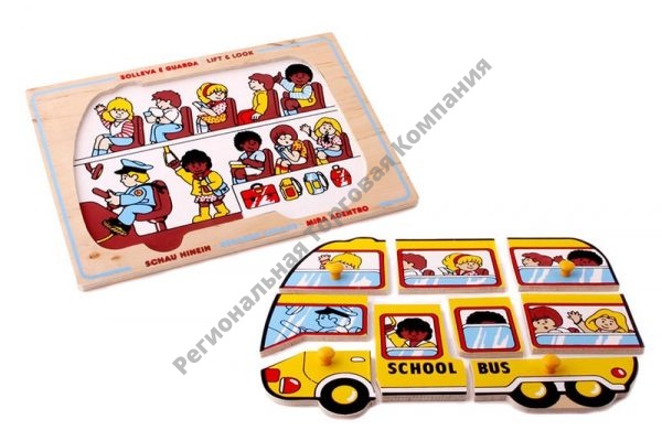 Деревянная картинка размером 29,5х20,5 см, на которой изображен школьный автобус, состоит из 9 элементов, четыре из которых снабжены удобными ручками. Под вкладышами нарисован внутренний вид салона школьного автобуса. Головоломка позволяет «снять» боковую часть кузова, а при сборке ориентироваться на стекла машин, рисунок которых частично дублирует внутреннее изображение.