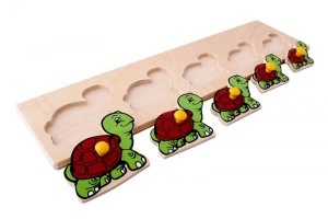 Деревянный планшет размером 37х10 см из серии «от большого к меньшему», на котором размещены 5 вкладышей в виде черепах с ручками-кнопочками. Вкладыши уменьшаются в размерах от большего к меньшему в направлении слева направо. Логическая разборная доска-вкладыш помимо развития мелкой моторики поможет сформировать у малыша представления о величине и количестве, научит его осмысленно употреблять слова «большой», «маленький», «средний», «самый маленький», «самый большой», «больше чем», «меньше чем».