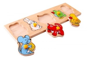 Доска-вкладыш представляет собой деревянную панель и 5 разных картинок, на которых изображены детеныши животных (мышка, зайчик…), каждая из которых снабжена удобной ручкой. Пособие развивает и тренирует мелкую моторику, внимание, формирует элементарные счетные умения и пространственные ориентировки (слева, справа, в центре).