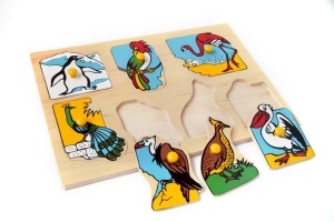 Игровое пособие представляет собой деревянный планшет размером 29,5*20,5*0,9 см, на котором находятся 7 вкладышей-«островов» с изображением экзотических птиц: пингвина, попугая, фламинго, павлина, грифа, дрофы и пеликана. На каждом вкладыше имеется ручка-кнопочка для удобства пользователей.