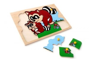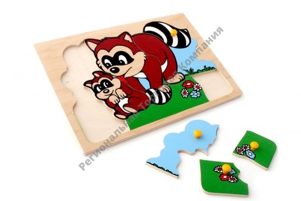 Вкладыш-головоломка размером 29,5х20,5 см, на котором изображен енот с детенышем. На вкладышах головоломки имеются ручки-кнопочки. Открыв эти элементы, ребёнок должен их закрыть, подобрав нужную по размеру и рисунку часть.