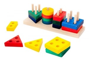 Эта развивающая игрушка представляет собой деревянную основу размером 23х8 см с деревянными штырьками, на которые надо нанизать 16 разноцветных геометрических фигур: по четыре каждой формы — круг, квадрат, треугольник, прямоугольник. В фигурках имеются дырочки: в круге – одна, в прямоугольнике – две, в треугольнике – три, в квадрате – четыре. Играя с фигурками, можно строить пирамидки из разнородных фигур, а взяв шнурок, превратить фигурку в шнуровку.