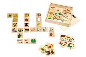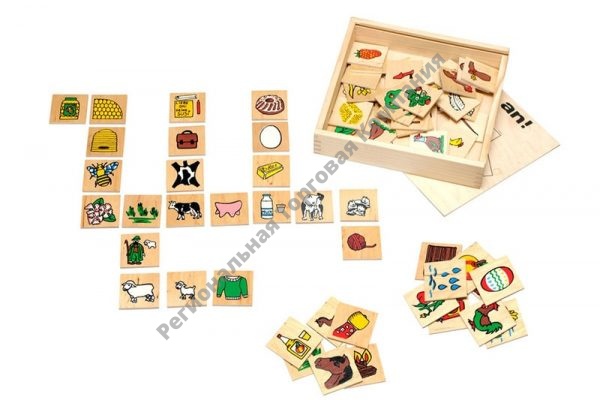 Игровое пособие состоит из 72 квадратных карточек, изготовленных из дерева. Размер карточек 5х5 см. Карточки размещаются в коробке, на крышке которой представлена схема подбора картинок по тематическому принципу в их временной последовательности.