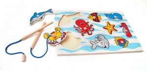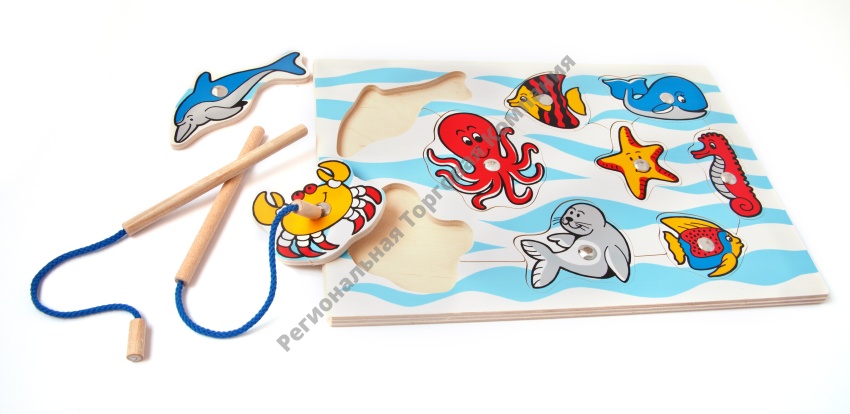 На каждом вкладыше есть гладкая железная шляпка-заклепка, а к доске прилагается две деревянные удочки с магнитом на конце.