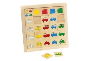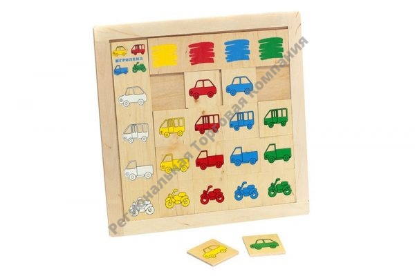 Игровой набор состоит из деревянного планшета 27х27 см и 16 карточек с изображениями различных моделей машнок размером 5х5 см. На деревянное панно укладывается полоска с машинами разных моделей (машины не раскрашены), в верхней части необходимо установить полоску с красками. Малышу необходимо разместить карточки с цветными машинками в нужном порядке, ориентируясь на планки, уложенные вдоль панно, пытаясь классифицировать предметы, выделяя заданные признаки.