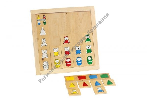 Игровой набор состоит из деревянного планшета 27х27 см и 16 карточек с изображениями различных предметов размером 5х5 см. На деревянном панно нанесены схематичные изображения неваляшки, мишки, куклы и пирамидки, а также даны цветовые подсказки для определенного расположения цветных изображений на панно. Малышу необходимо разместить карточки в нужном порядке, пытаясь классифицировать предметы, выделяя заданные признаки.