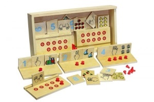 Обучающий комплекс «Учимся считать» (счет от 1 до 10) состоит из 97 элементов: 10 деревянных основ с с продольной прорезью и круглыми отверстиями (от 1 до 10 в каждом); 30 квадратных табличек размером 5х5 см (10 — с цифрами от 1 до 10; 10 — с изображениями рук, пальцами которых показано число от 1 до 10; 10 — с изображениями предметов в количестве от 1 до 10); 57 фишек красного цвета. В каждую основу вставляется три таблички, одина из которых с цифрой, другая — с изображением определенного количества пальцев на руках, третья — с изображением определенного количества предметов. Ребенку необходимо вставить в отверстия нужное количество фишек, осваивая при этом навыки счета, запоминая цифры.