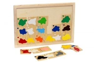 На деревянном планшете размером 33х23 см расположены 24 вкладыша в виде пазлов с изображением кляксы различных цветов. Соединяя вкладыши, малыши смогут узнать, как при момощи основных цветов можно получить другие оттенки и полутона: зеленый цвет можно получить, смешав краску синего и желтого цветов, а розовый цвет получается при смешении белой и красной краски. Даже если ребенок не соединит нужные цвета, он подберет их по форме разреза пазлов. Ни в одной из комбинаций красок этот разрез не совпадает и, значит, составить неверную комбинацию просто невозможно.
