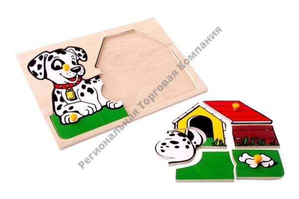 Вкладыш-головоломка размером 29,5х20,5 см, на котором изображена собачка рядом с будкой. На вкладышах головоломки имеются ручки-кнопочки. Открыв эти элементы, ребёнок должен их закрыть, подобрав нужную по размеру и рисунку часть.