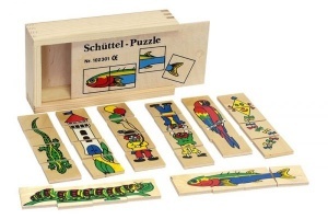 Игра представляет собой 32 деревянных квадратных карточки размером 3,5х3,5 см, из которых собирается 8 картинок, состоящих из 4 частей каждая: рыба, гусеница, ящерица, попугай, клоун с шарами, башня, воздушный змей «Лу-лу», два акробата. Составные картинки из 4 деталей помещены в деревянную коробку с крышкой-задвижкой.