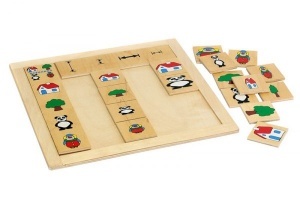 Игровой набор «Сравни и подбери» состоит из планшета 27х27 см и 16 карточек 5х5 см с изображениями различных предметов. На левой стороне планшета по вертикали изображены предметы стандартных размеров, а сверху по горизонтали стрелочками обозначены сравнительные размеры изображенных предметов, которые надо выстроить по этому признаку в столбец (высокий, низкий, толстый, тонкий).