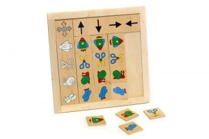 Игра состоит из деревянного планшета размером 27х27 см, в котором размещены 1 планка со схематическими изображениями предметов и 1 планка со стрелками, и 16 карточек с цветными изображениями предметов, размещенных на планке, размером 5х5 см. В процессе игры ребенку необходимо расположить предмет в нужной графе в указанном стрелкой положении.