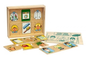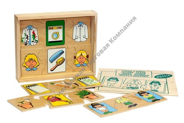 В игровое пособие входят 8 сборных картинок, состоящих из 3 частей: первая часть изображает действие в его начале, в середней части помещено изображение средства, с помощью которого достигается результат, третья часть изображает сам результат, финал. Средство, приспособление, которым можно совершить необходимое преобразование, чтобы достичь желаемого результата — это расческа, стиральная машина, выключатель и т.п. Пособие используется для проведения словарно-логических игр и упражнений, введения обобщающих слов и таких понятий как ОРУДИЕ в словарь детей 5-8 лет. Занятия с этой игрой развивают аналитическое восприятие окружающего мира, способствуют формированию речи ребенка: составлению сложных предложений с целевыми и причинными отношениями.