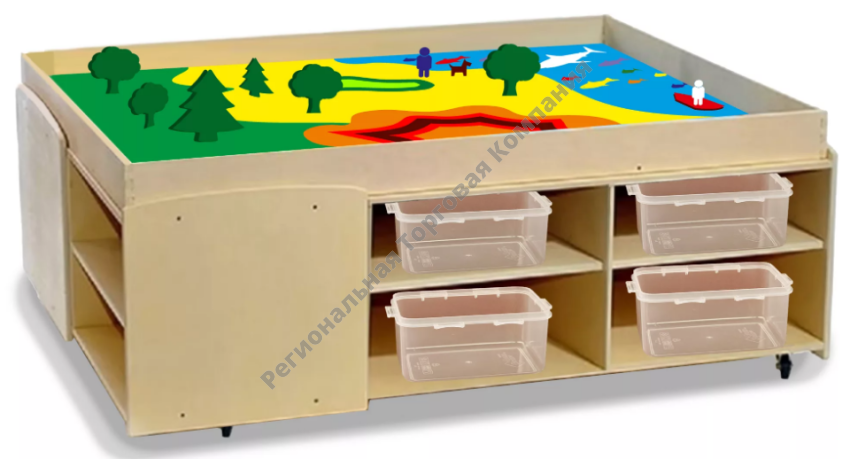 Ландшафтный стол станет эффективным инструментом в работе с детьми, требующими особого внимания, корректировки поведения, адаптации в окружающем мире. Деревянный стол оснащен встроенными полками для хранения аксессуаров, бортиками по периметру, колесиками, придающими конструкции мобильность. Размер стола позволяет играть одновременно 8 детям. Более 120 аксессуаров, в число которых входят домики, фигурки людей и животных, деревья, машинки и т.д. Они устойчиво стоят на горизонтальной плоскости. Комплект контейнеров состоит из 4 больших и 4 маленьких. Их используют для хранения аксессуаров. Размер позволяет разместить контейнеры с содержимым на полочках стола.