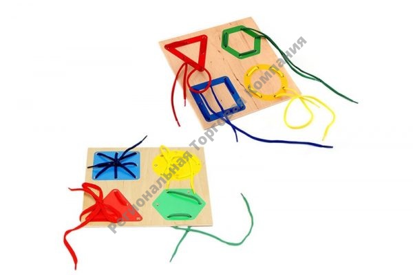 Шнуровка представляет собой деревянный планшет размером 20х20 см с изображением 4 цветных геометрических фигур (квадрат, круг, треугольник, шестиугольник) в которых по контуру проделаны отверстия для протягивания шнурка. С обратной стороны планшета такие же геометрические фигуры, но окрашенные полностью. Малышу необходимо шаг за шагом очертить шнурком контур фигуры, не пропустив ни одного отверстия. Развязать шнуровку — не менее сложная работа для ребенка.