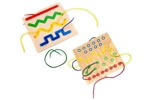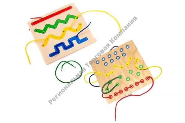 Шнуровка «Линии» представляет собой деревянный планшет с тридцатью четырьмя отверстиями, которые соединены в 4 разноцветные линии — прямую, зигзаг, волнистую и ломаную. На обратной стороне отверстия, соответствующие этим линиям, обозначены тем же цветом, что и линия на обороте: прямая линия — красным цветом, зигзаг — зеленым, волнистая — желтым, ломаная — синим. Малышу необходимо шаг за шагом соединить при помощи шнурка отверстия каждой линии, не пропустив ни одного. Развязать шнуровку — не менее сложная работа для ребенка.