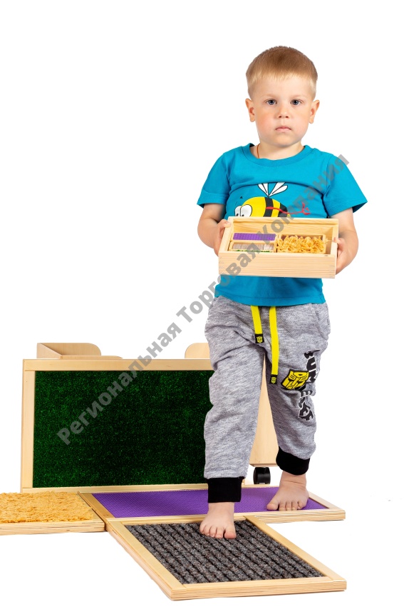 Составная сенсорная дорожка из 10 модулей на деревянной основе. На 9 элементах нанесены различные на ощупь фактуры, один элемент пустой, на него можно нанести любую фактуру. Элементы выстраиваются в единую дорожку, обучая ребенка в игровой форме отличать различные модули на ощупь.