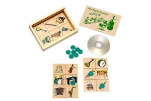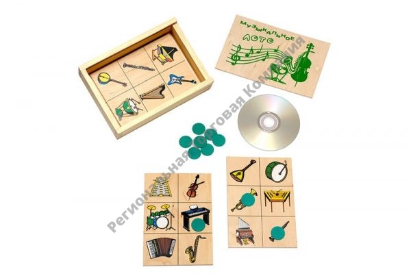 Деревянное развивающее звуковое лото «Музыкальные инструменты» состоит из 4 панелей размером 17х12 см, на которых изображены по 6 музыкальных инструментов, некоторые из которых повторяются и присутствуют на двух карточках. К лото прилагается диск с 24 звуковыми файлами — звуками, которые издают различные музыкальные инструменты.