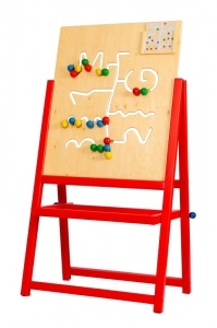 Двусторонняя неокрашенная панель стандартного размера с «экраном». «Экран» с фигурными сквозными прорезями в виде волн, зигзагов, лабиринтов и т.д. Внутри прорезей помещаются 20 двойных подвижных цветных штырьков: 5- красного, 5- синего, 5 – зеленого, 5- желтого цвета. Игровая задача – собрать штырьки какого – либо одного цвета в определенное место – «депо», проведя их через все встречающиеся на пути препятствия. На панели находится кармашек для карточек с заданиями.