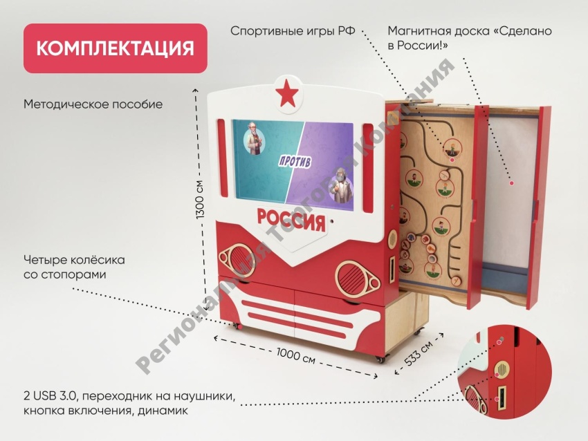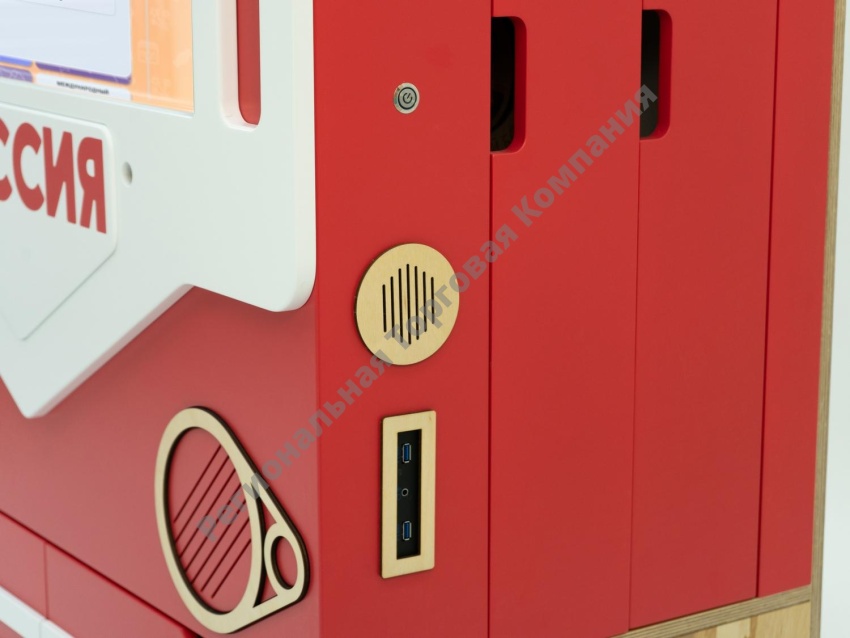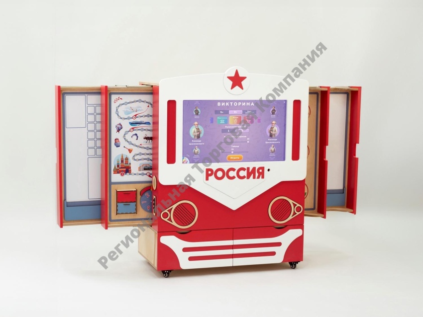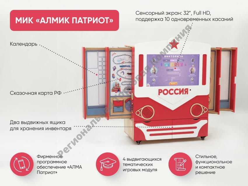 Главным центром притяжения является интерактивная сенсорная панель – на ней установлено фирменное программное обеспечение «АЛМА Патриот», состоящее из 5 тематических блоков: карта России, национальные праздники, государственность, выдающиеся личности, викторина. Также дополнительно идёт пакет общеразвивающих ПО: «АЛМА Дошкольное образование», «5 Островов» и раскраска «Оживариум».
